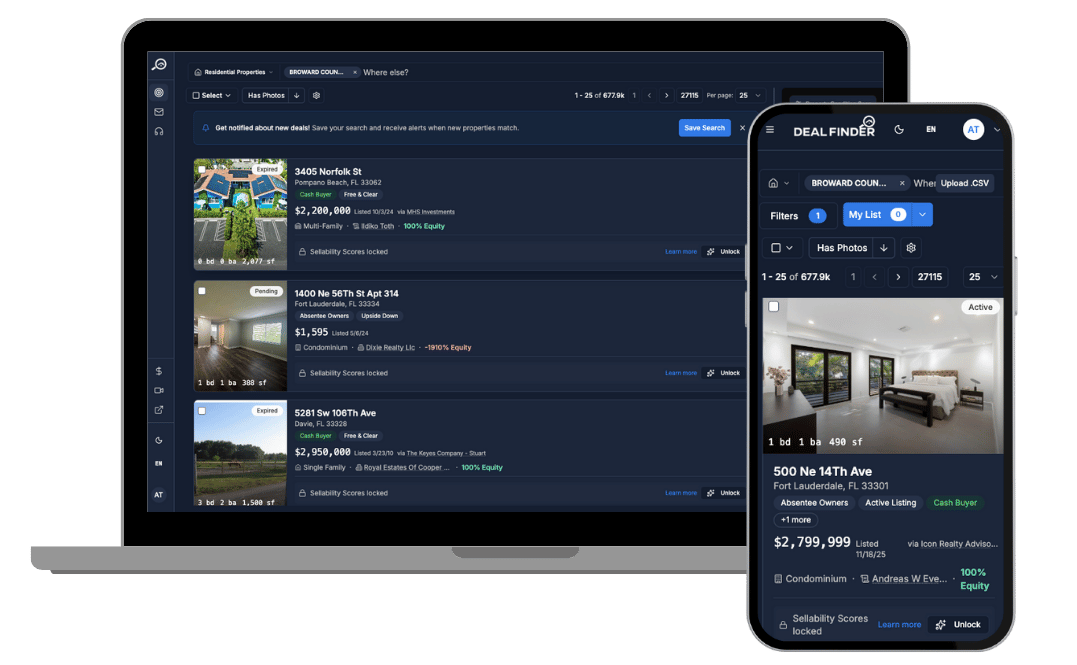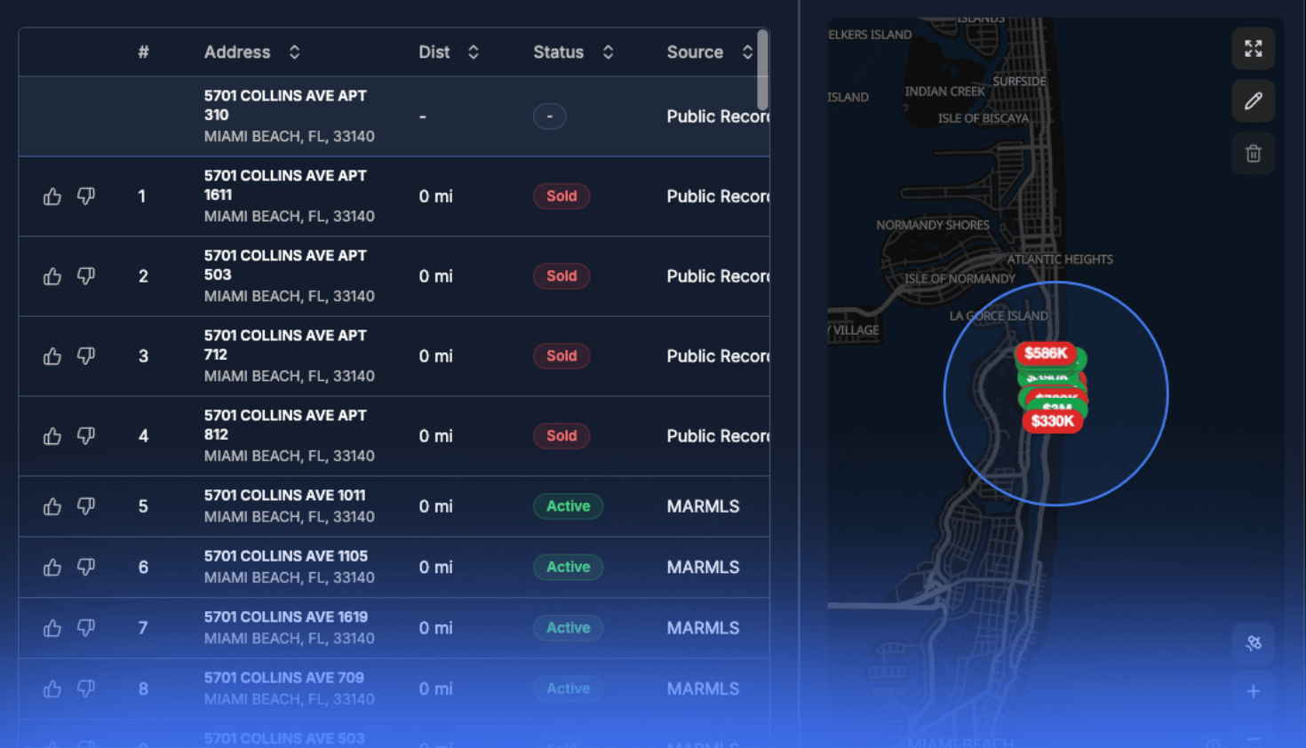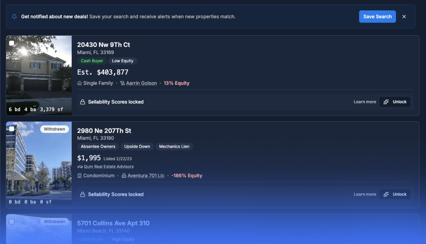 Pull MLS and off-market comps in about 60 seconds so you know exactly what a property is worth before you make the offer. See tax liens, mortgage defaults, and pre-foreclosure signals that tell you which sellers are under real pressure.