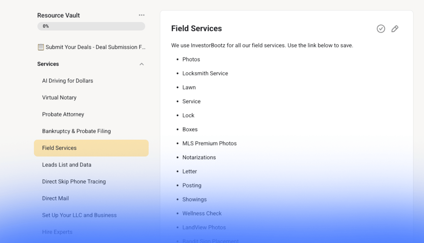 Notary services. Title companies. Lenders. Contractors. Data sources. Everything we use to run deals efficiently.