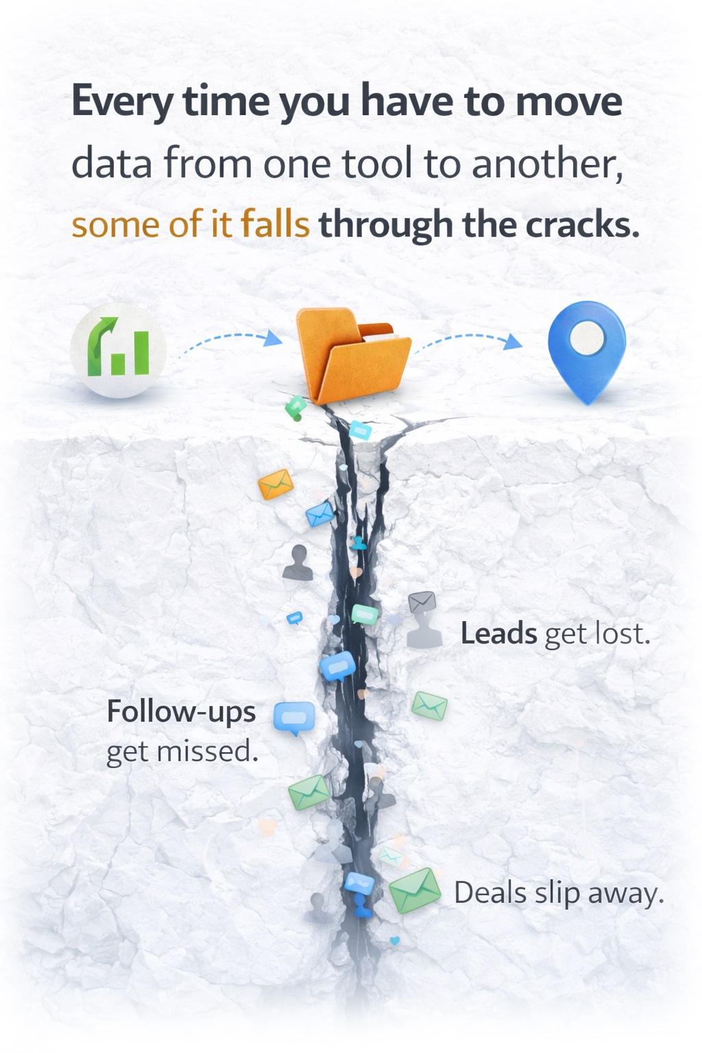 Every lead, every call, every follow-up — tracked in one place. No more deals dying because something fell through the cracks.